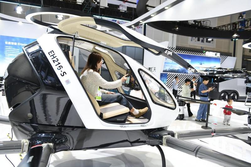 EHang's EH216-S, a pilotless passenger-carrying aerial vehicle, is on display, showcasing its potential in sectors such as manned transportation, aerial tourism, aerial logistics and medical emergency response. With a flight endurance range of up to 30 kilometers, the vehicle effectively offers an efficient alternative to congested roads, a staff member at EHang's booth said.
